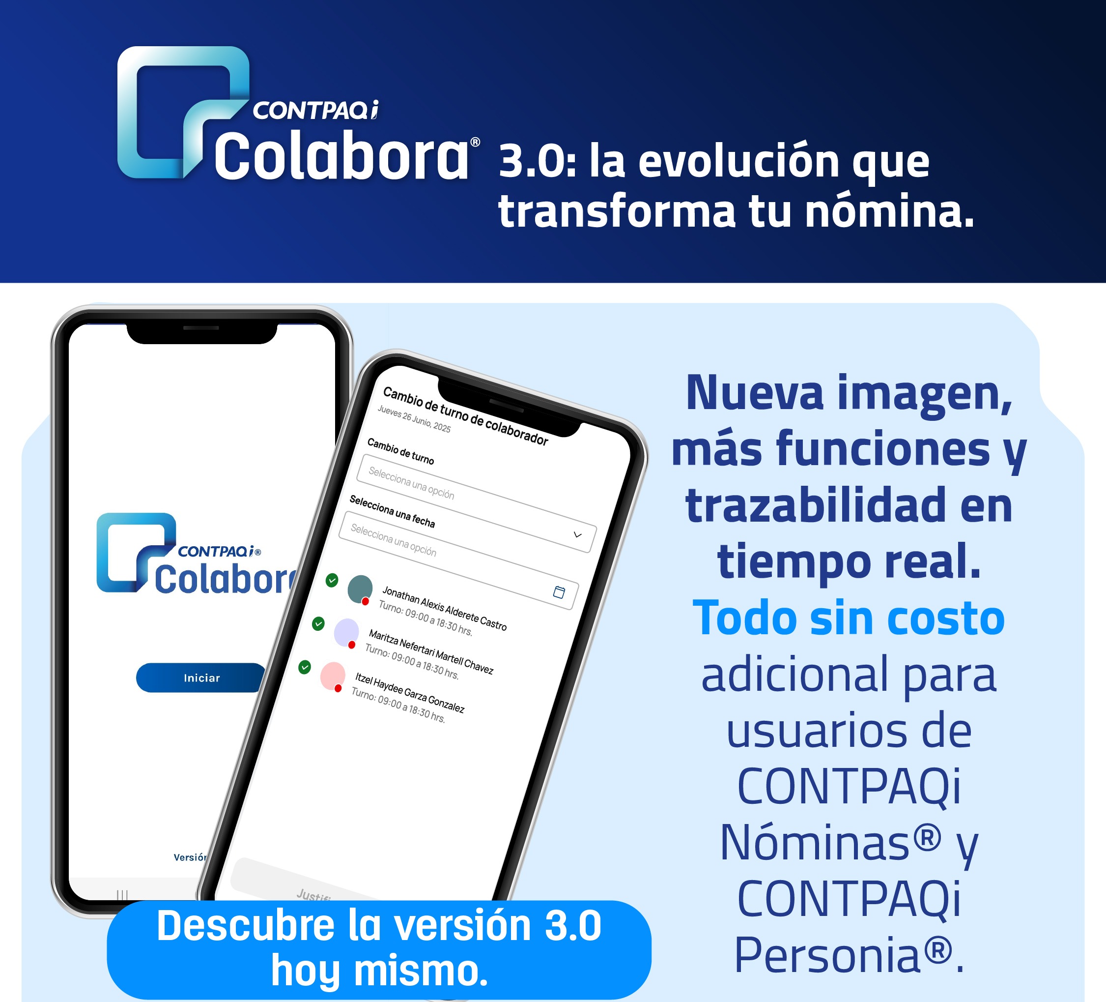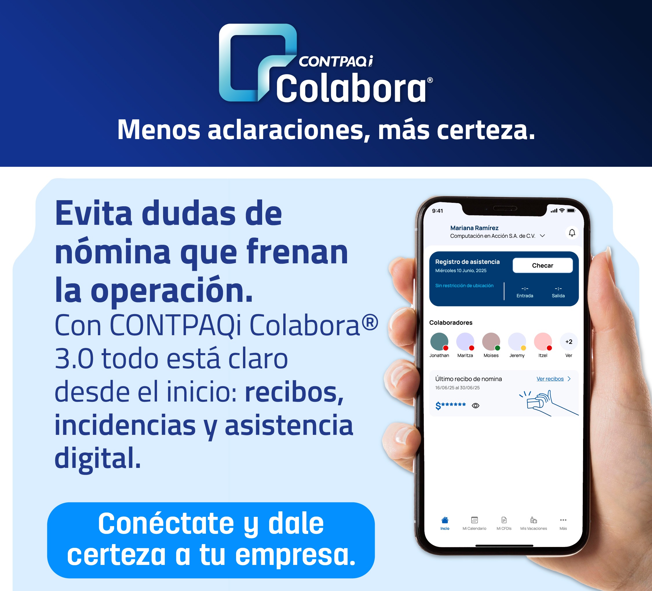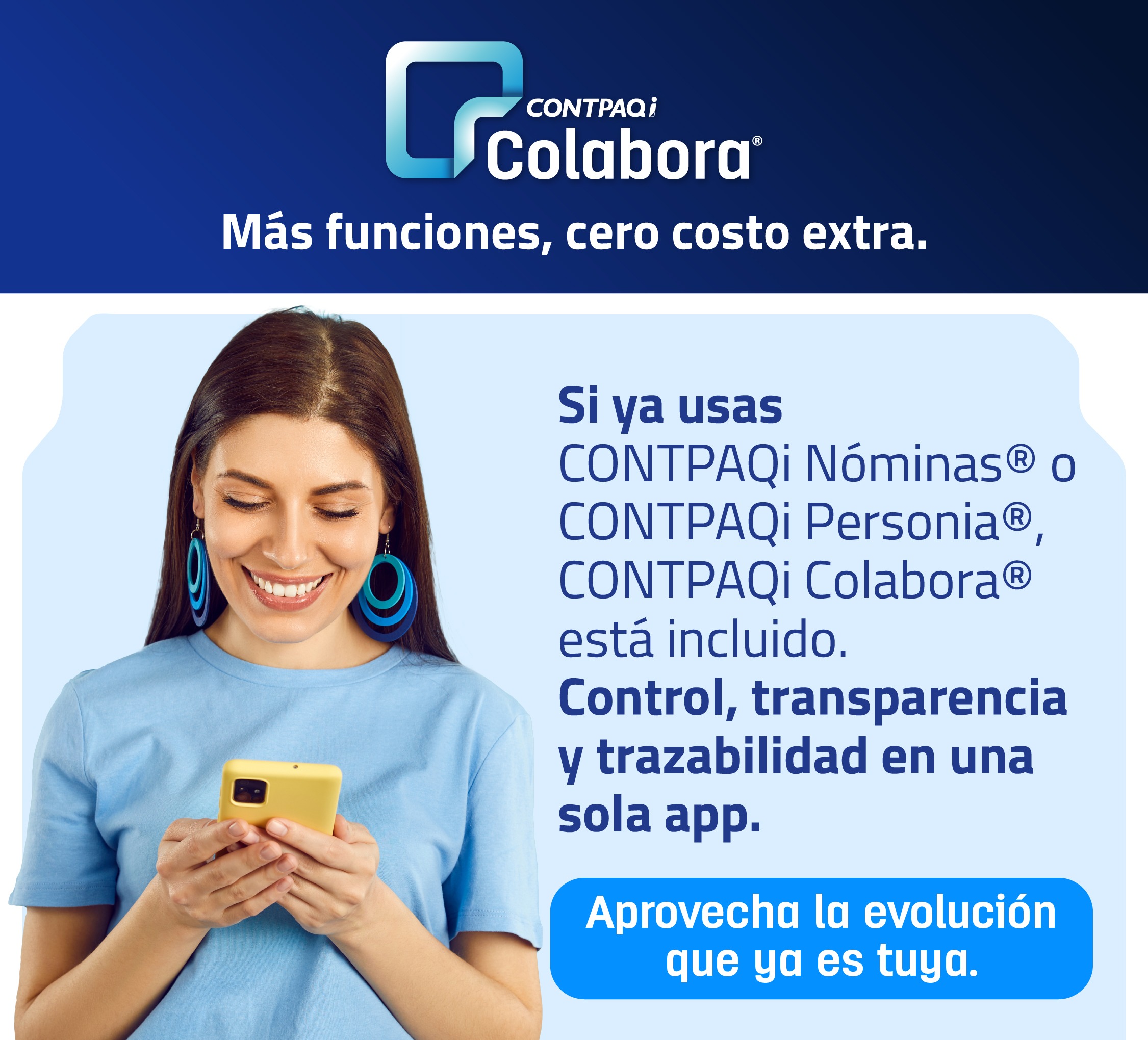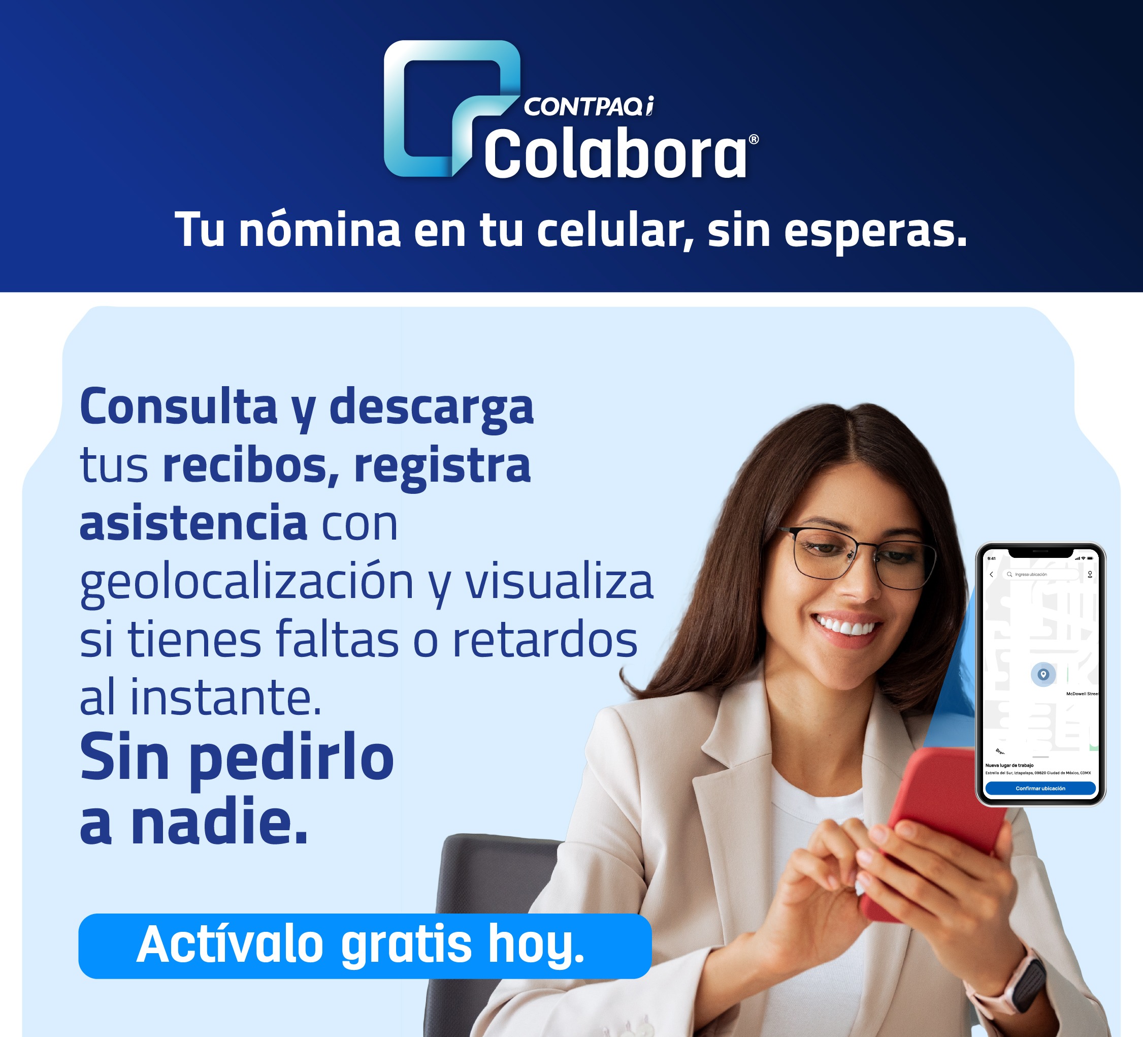 CONTPAQi Colabora® es una solución en la nube diseñada para fortalecer la comunicación entre empresas y colaboradores. A través de su plataforma y app móvil, permite la descarga de CFDI de nómina, actualización de datos personales y registro de asistencia con geolocalización. Optimiza la gestión de recursos humanos, fomenta el autoservicio y asegura transparencia en la administración de incidencias y horarios de trabajo